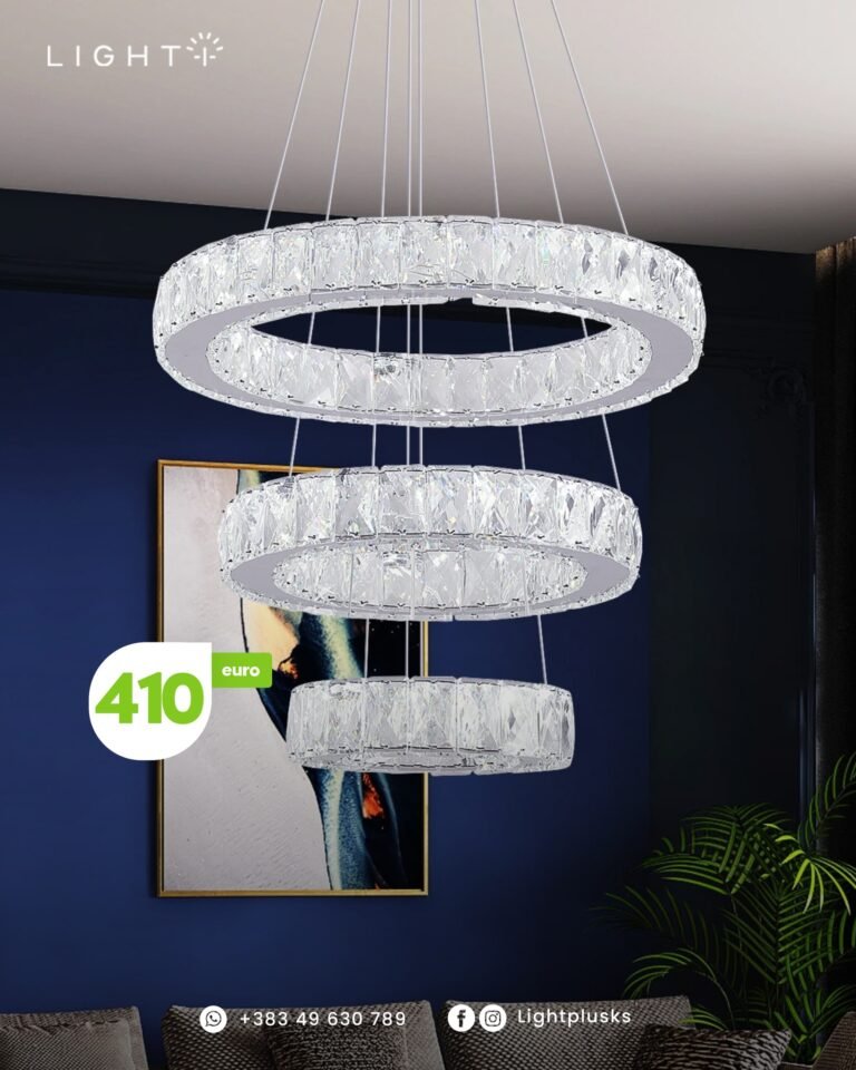 Ky llambadar luksoz me tre unaza kristali nga Light+ sjell një dizajn modern dhe sofistikim të rrallë për çdo ambient të brendshëm.